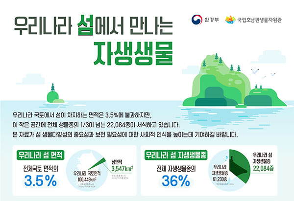 국립호남권생물자원관은 ‘섬 지역 자생생물 조사·확보·발굴 연구 사업’을 통해 우리나라 섬에 서식하는 자생생물 목록 총 22,084종을 확인했다. 도서생물자원연구실은 2021년부터 2024년까지 ‘섬 지역 생물 종목록’ 구축을 통해 19,237종을 확인했으며 올해 자생생물 조사·확보·발굴 연구를 통해 2,847종을 추가로 밝혀내며 총 22,084종의 섬 자생생물을 기록했다. 현재 우리나라 섬 면적은 3,547㎢로 국토의 약 3.5%에 불과하지만, 이 공간에 서식하는 생물은 지금까지 밝혀진 자생생물 61,230종 중 36%를 차지해, 섬이 생물다양성의 보고이자 핵심 연구 대상지임을 보여준다. 주요 서식 생물로는 곤충류 6,683종, 세균류 3,273종, 관속식물 3,006종, 무척추동물(곤충 제외) 2,501종 등이 있으며 이외에도 섬과 연안에서만 서식하는 ‘닻무늬길앞잡이’를 포함한 멸종위기 야생생물 148종, 가거도에 자생하는 ‘가거개별꽃’을 포함한 우리나라 고유종 486종, 기후변화에 민감하게 반응하는 ‘검은큰따개비’를 포함한 기후변화 생물지표종 92종 등 생물다양성 보전 가치가 높은 종도 다수 포함되어 있다. 국립호남권생물자원관은 이번 조사 결과를 바탕으로 섬 생물다양성의 가치를 널리 알리고자 ‘우리나라 섬 생물다양성’ 정보 그림을 제작해 국립호남권생물자원관 누리집(www.hnibr.re.kr)을 통해 공개 중이며, 포스터 형태로도 제작·배포했다.